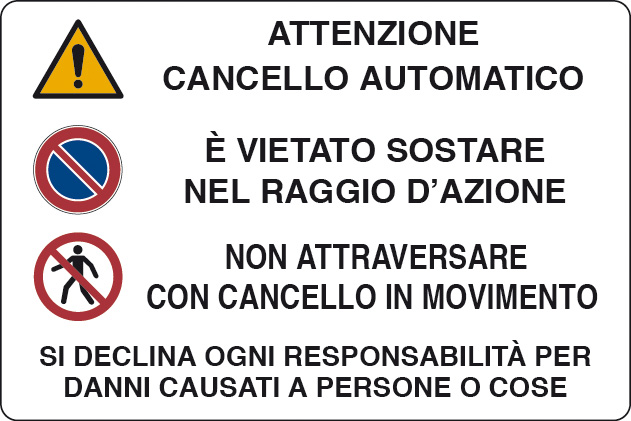 Acquistabile in confezione da 10Targhe segnaletiche – Targa segnaletica attenzione cancello automaticoID: 23232 – Rif: U0400010PLB 3X2