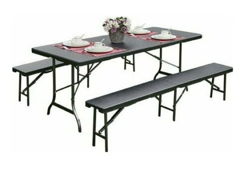 Tavolo ferro con 2 panche – 3 gambe in rattana hdpe 180x75x74