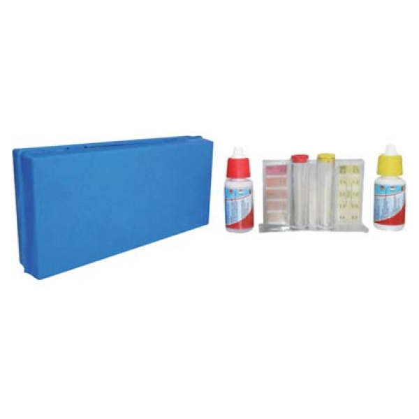 Sistema di misurazione manuale a gocce per determinare i valori di PH e Cloro. Completo di 1 provetta per analisi colorimetrica, 1 flacone da Ml. 20 di ortotolidina per l’analisi del cloro libero e 1 Flacone da Ml. 20 di red-phenol per l’analisi del PH.
