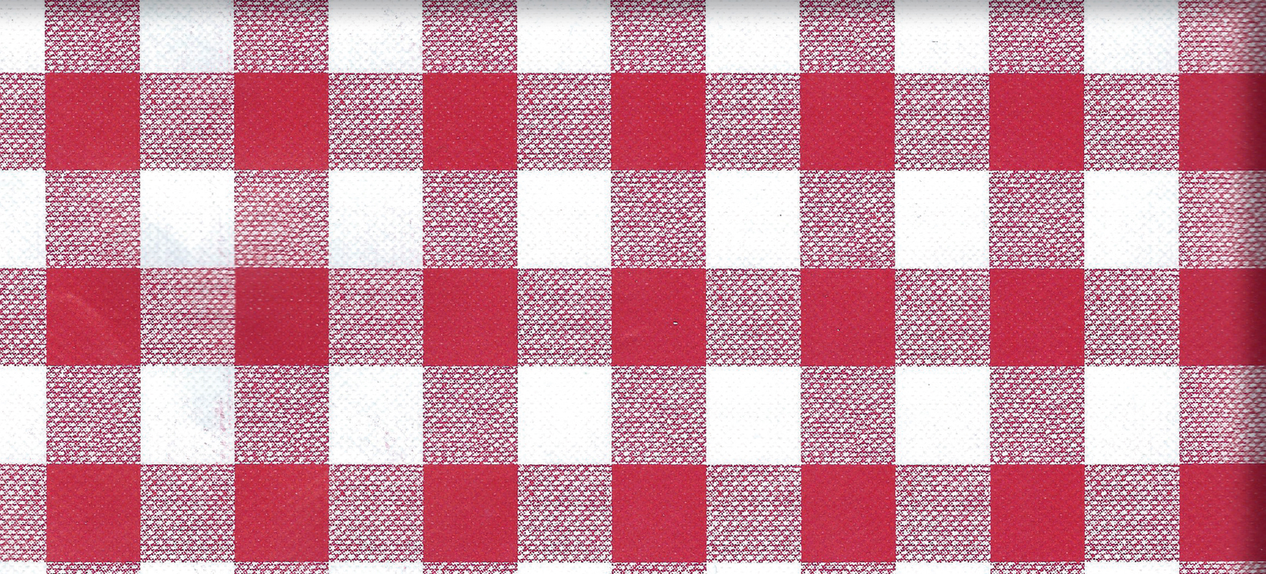 PVC stampato accoppiato a tessuto di polipropilene. Altezza 140 cm. Quadri rossi 1,5 x 1,5 cm. Rotolo da 20 m.