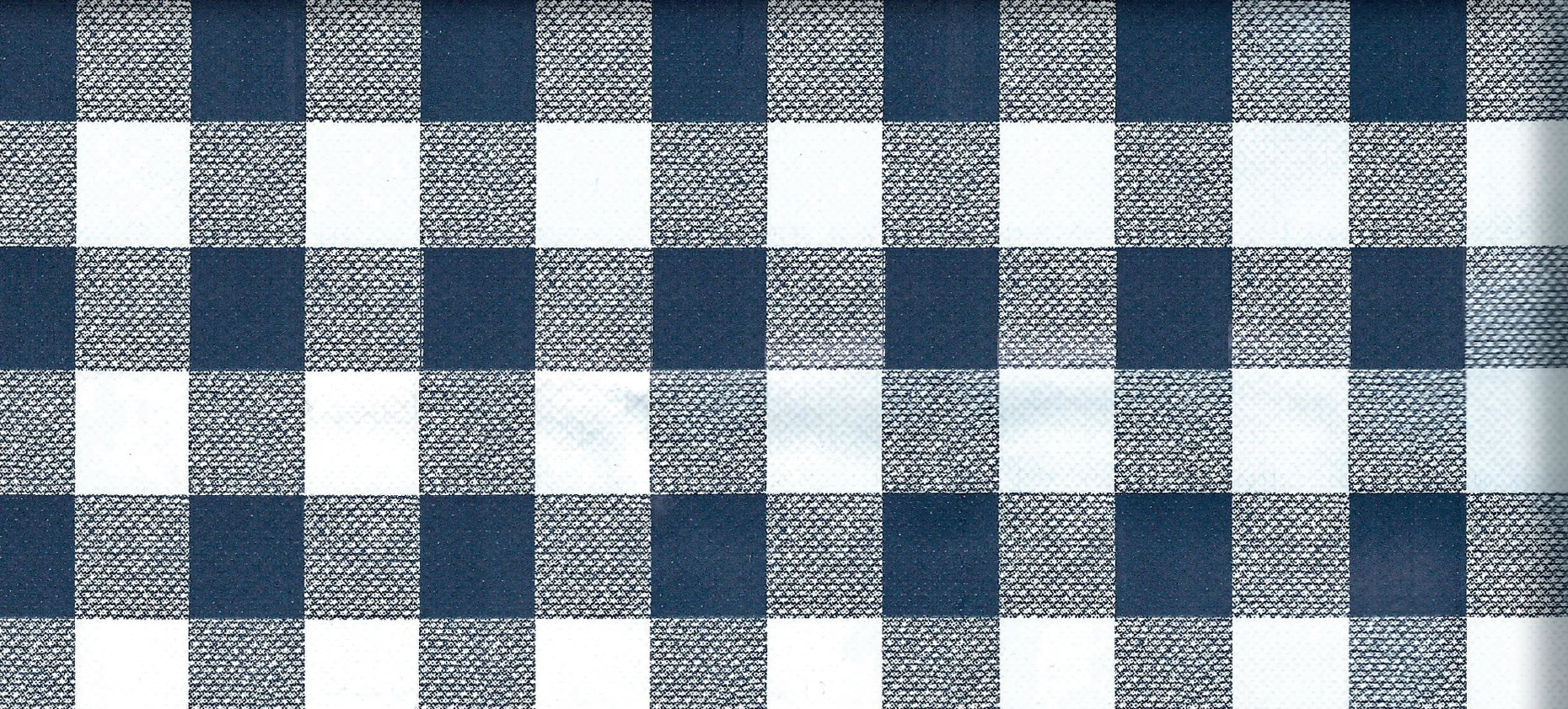 PVC stampato accoppiato a tessuto di polipropilene. Altezza 140 cm. Quadri blu 1,5 x 1,5 cm. Rotolo da 20 m.