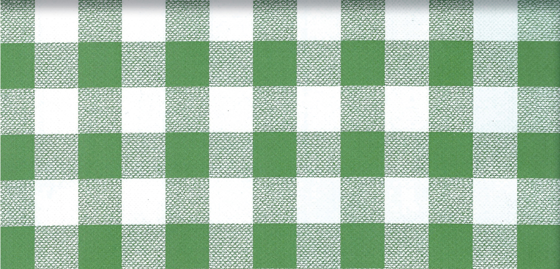 PVC stampato accoppiato a tessuto di polipropilene. Altezza 140 cm. Quadri verde 1,5 x 1,5 cm. Rotolo da 20 m.