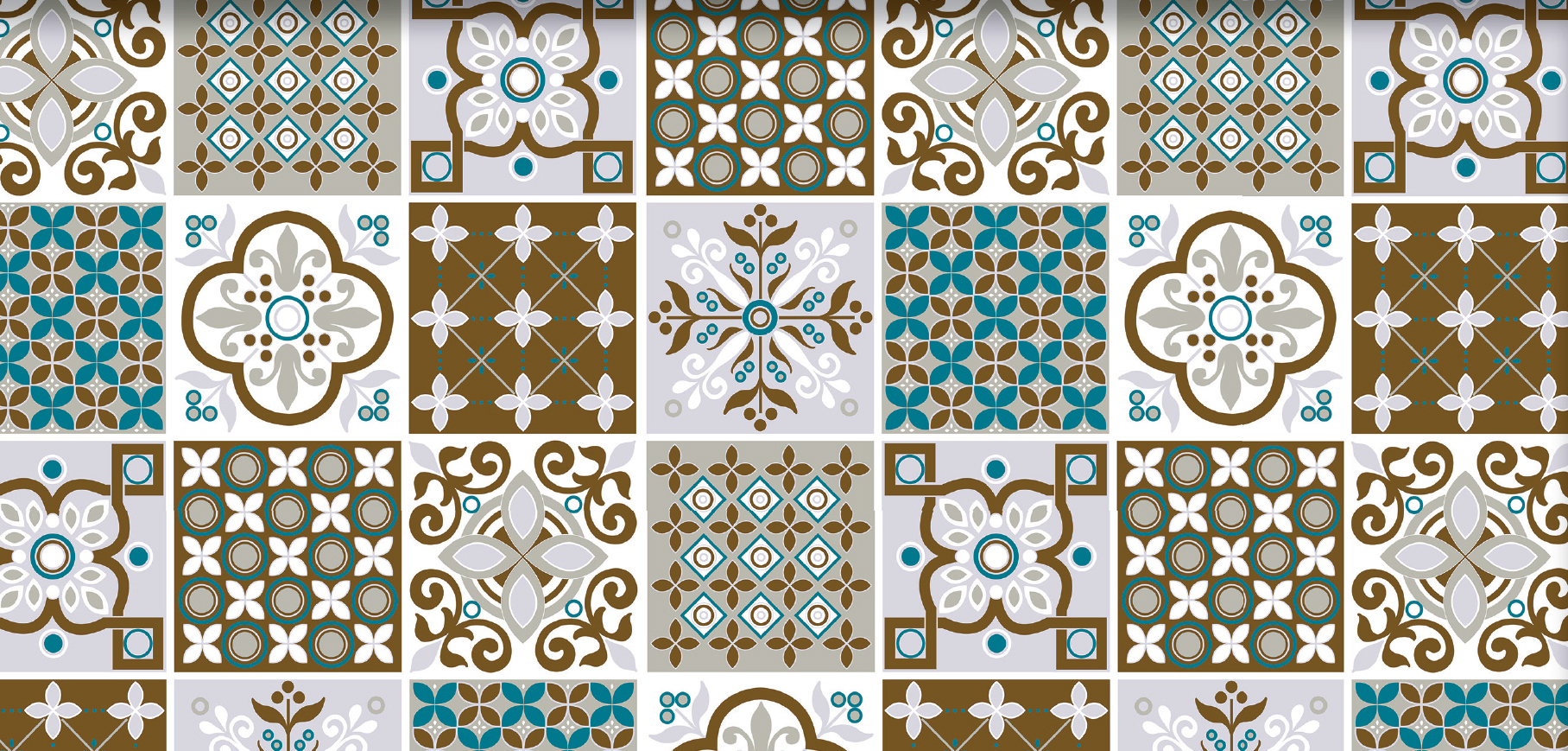 PVC stampato accoppiato a tessuto di polipropilene. Altezza 140 cm. Fantasia patchwork marrone e azzurro. Rotolo da 20 m.