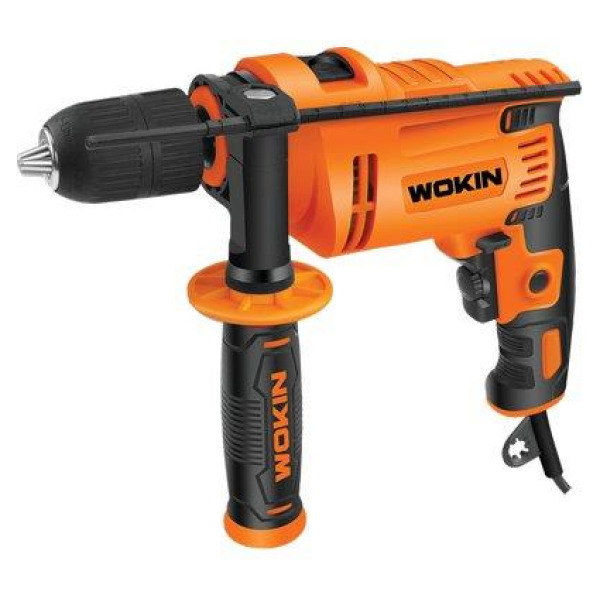 Mandrino autoserrante da Mm. 13. Selettore per esclusione della percussione. Reversibile. Regolazione elettronica dei giri con preselettore. Giri/Min. 0-2.900. Blocco interruttore. Capacità di foratura nel legno Mm. 25, Mm. 13 nel muro e Mm. 13 nel metallo. Cavo da Mt. 2. In dotazione: asta di profondità e impugnatura supplementare.