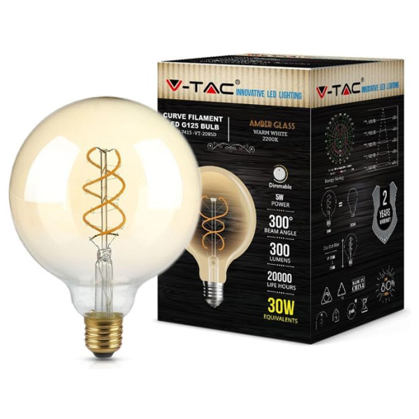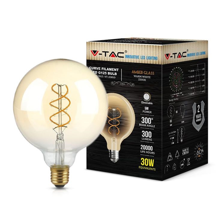 V-tac vt-2085d lampadina led e27 5w g125 filamente ambrato 2200k dimmerabile- sku 7415