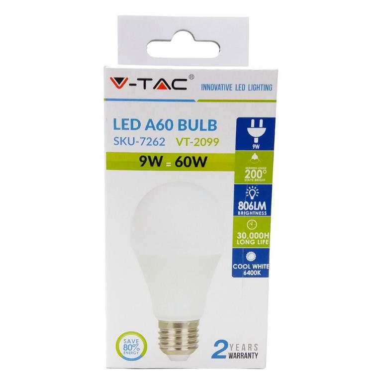 V-tac vt-2099 lampadina led e27 9w bulb a60 – bianco freddo 6400k – sku 7262