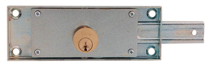 Art. 8232 Struttura e componenti interni in acciaio zincato. Serratura laterale destra. Catenacci rinforzati ad 1 mandata in acciaio di spessore 2 mm, ripiegati su loro stessi in modo da ottenere uno spessore complessivo di 6,5 mm. Corsa 24 mm. Cilindro in ottone massiccio fisso, sporgente 9 mm per serrande pi spesse e pesanti. 2 chiavi in ottone. Scatola 155×55 mm. Altezza della cassa 15 mm. Peso 465 g.