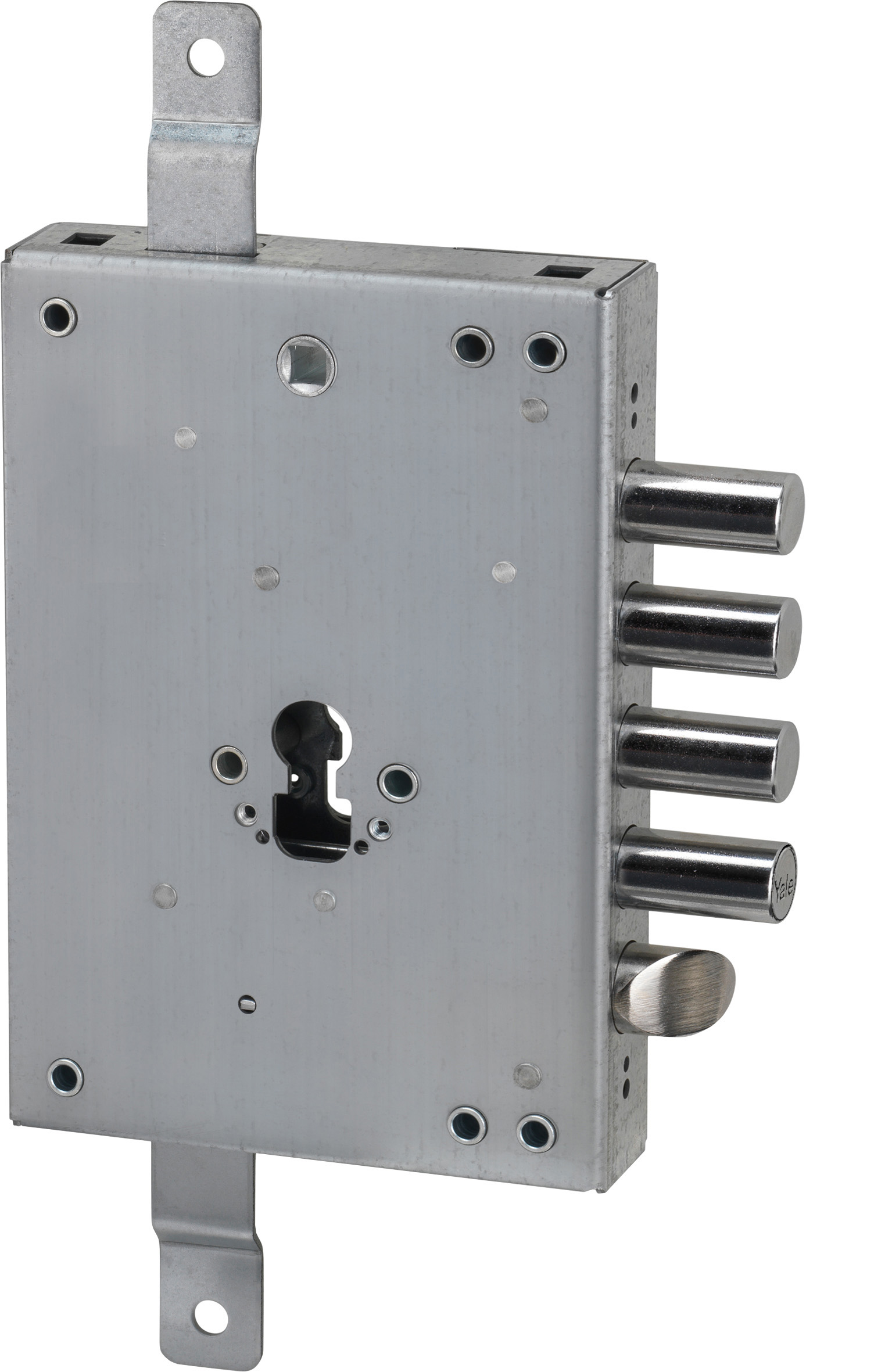 Mod. Y135 per porte blindate. Chiusura triplice con 4 catenacci e scrocco reversibile. Scatola mm 136×206 Entrata mm 63 Certificato classe 7 EN 12209 con l’aggiunta della piastra di protezione al manganese. Compatibile con serratura Mottura