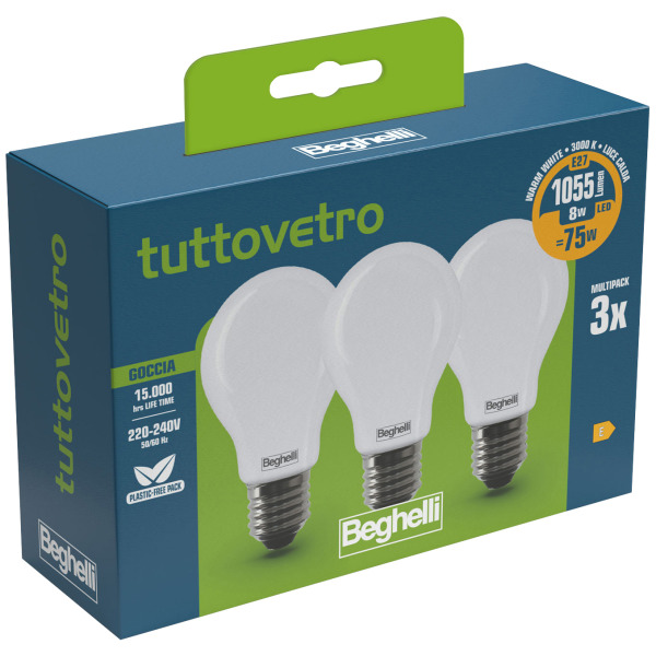 Beghelli led goccia e27 8w 58050 calda 3000k 3 pz - Ordine minimo 10 pezzi